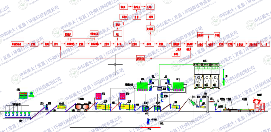 成的物料同時(shí)進(jìn)入臥式粉碎機(jī)進(jìn)行粉碎。粉碎好的物料經(jīng)皮帶輸送機(jī)送入分篩機(jī)進(jìn)行篩分,篩上物返回粉碎工序進(jìn)行粉碎,篩下物符合標(biāo)準(zhǔn)的包裝成成品入庫(kù)。